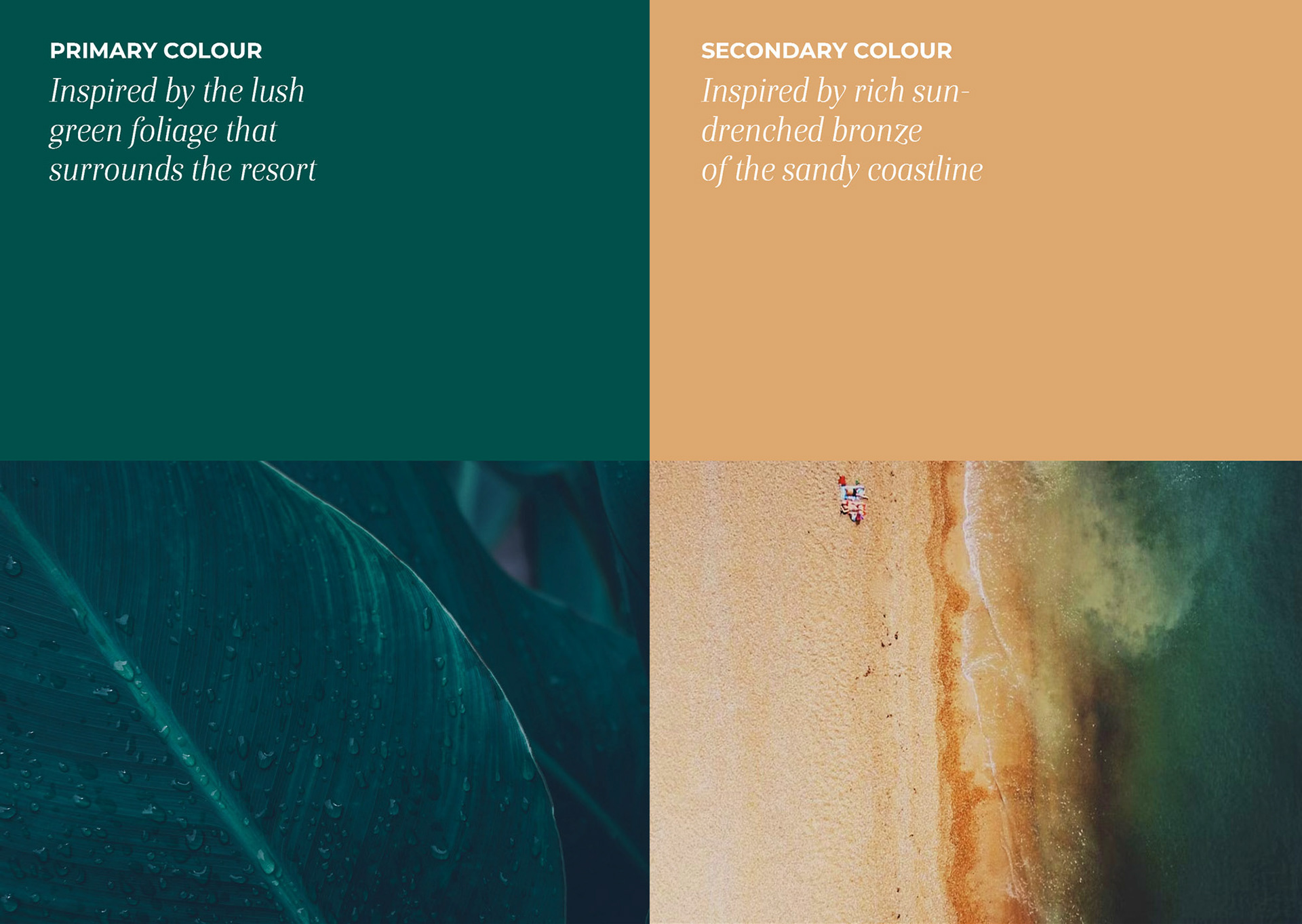 I was also tasked with updating the brand colour palette to better reflect the vibrancy of the property. Inspired by a line from Royce — that brand design should communicate what it's like to be there — I was inspired by real elements of the environment, from the sandy beaches, native foliage found on the grounds, details of the room design and decor, to the wide varety of guest amentities available.