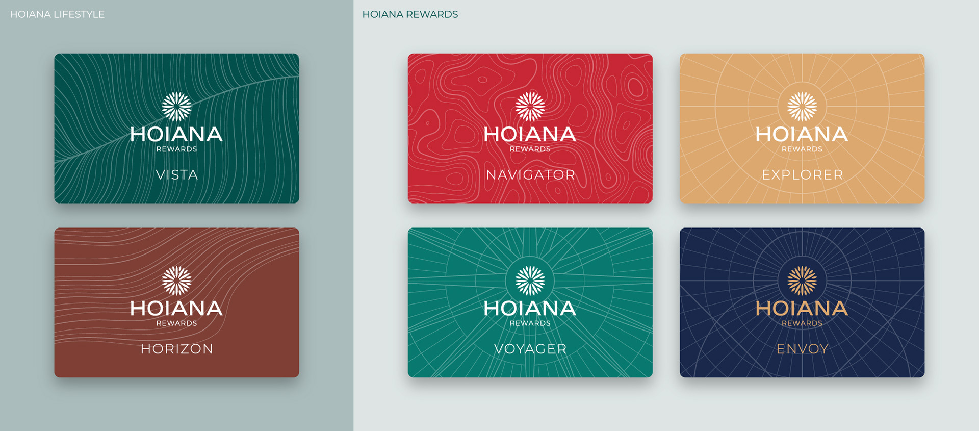 Royce and I were also tasked with reconcepting and redesigning the existing Hoiana Rewards Program (critical for any hospitality brand) to fit its new brand theme and narrative. We went with an exploration theme, and used colours from the new brand palette for quick recognition.