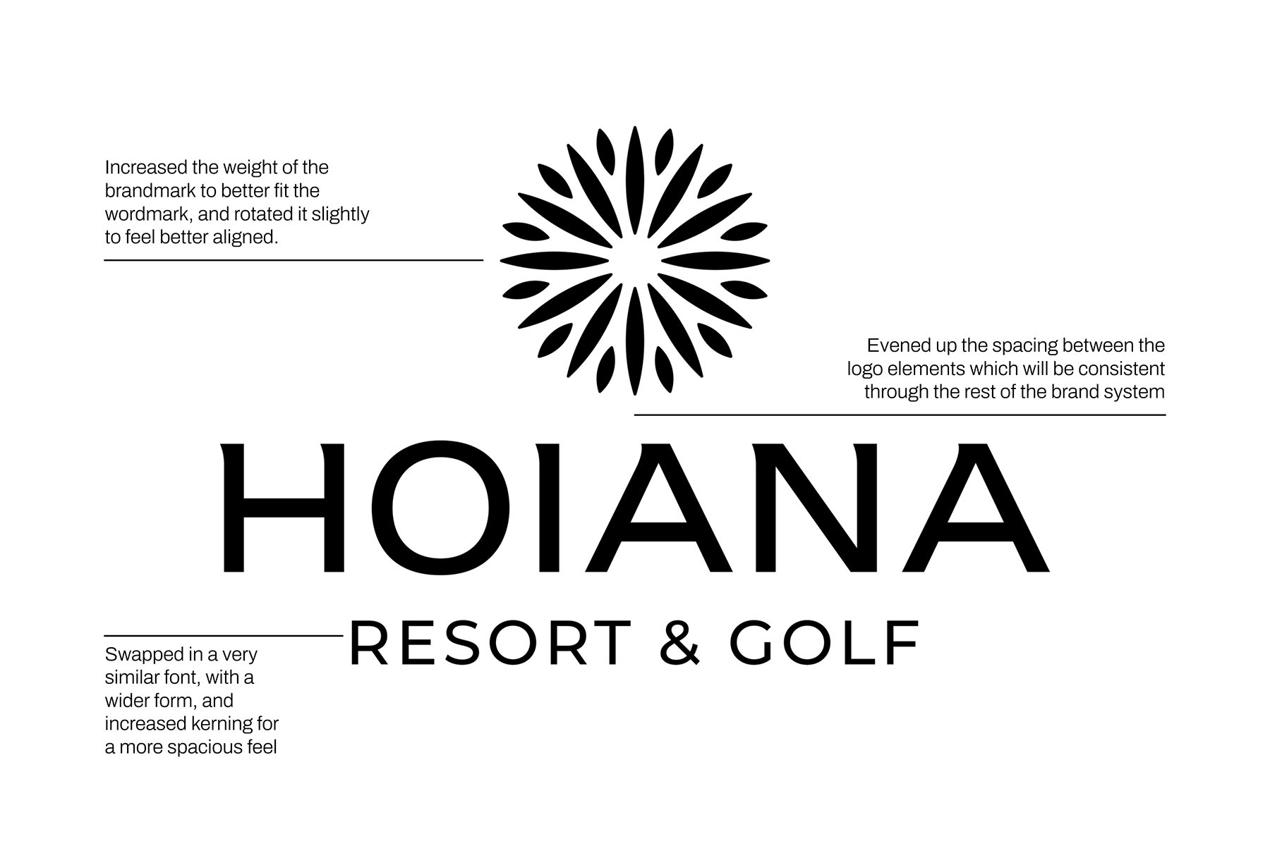With 5 years of existing brand recognition and legacy, the status of Hoiana as a Master Brand, as well as understanding the difficulty of rebranding hotel in operation, clients and I decided to retain the wordmark. Instead I updated the brandmark, typography, and spacing to modernise the logo while maintaining its recognisability.