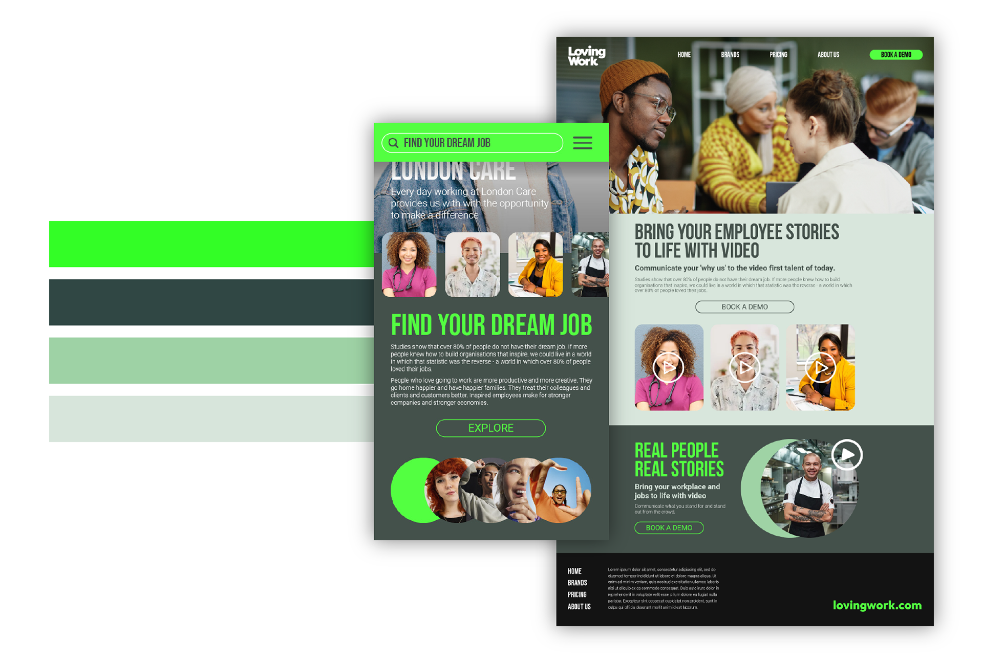 Loving Work is a video storytelling recruitment platform seeking to connect Gen Z job seekers with employer brands. Upon successfully acquiring seed capital, their first step was to invest in professional brand stragegy + identity design that would shine on digital, represent the vision of the brand, and engage with audiences on both sides of the hiring line.