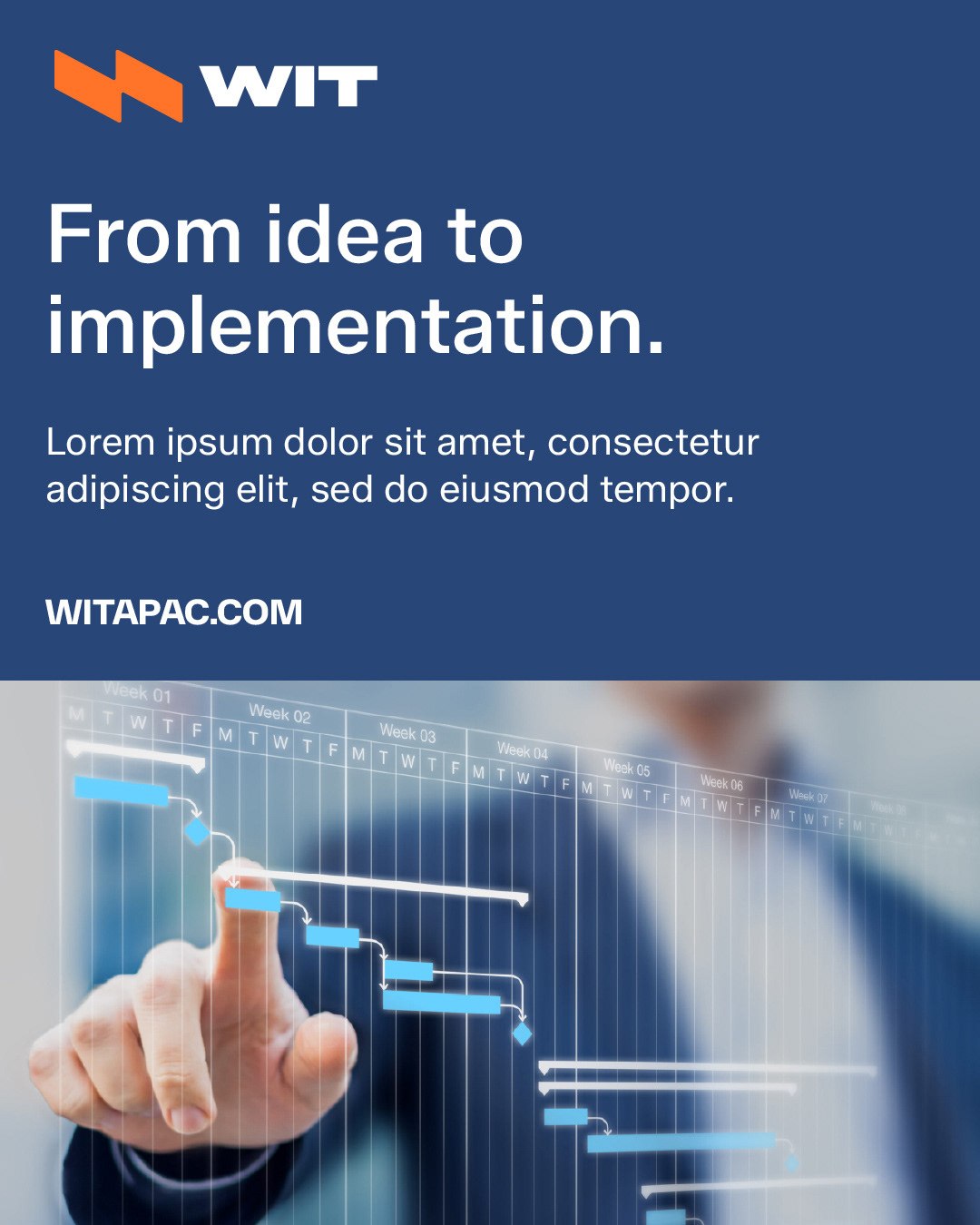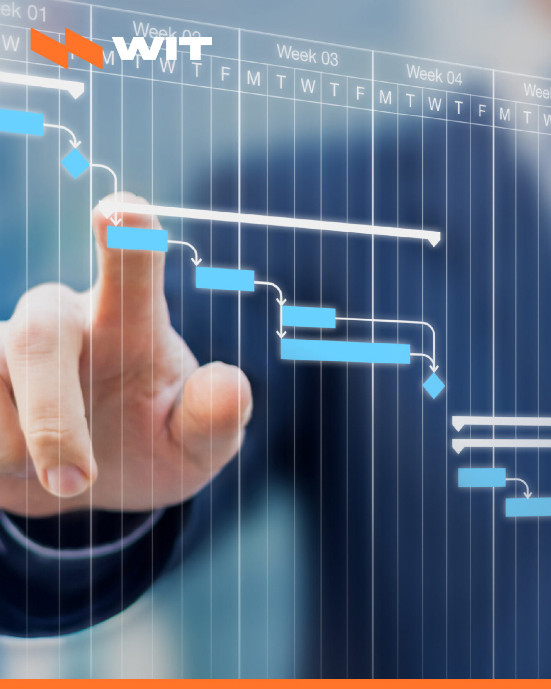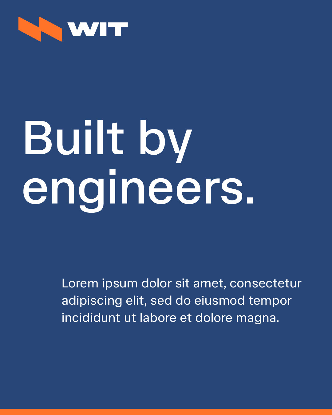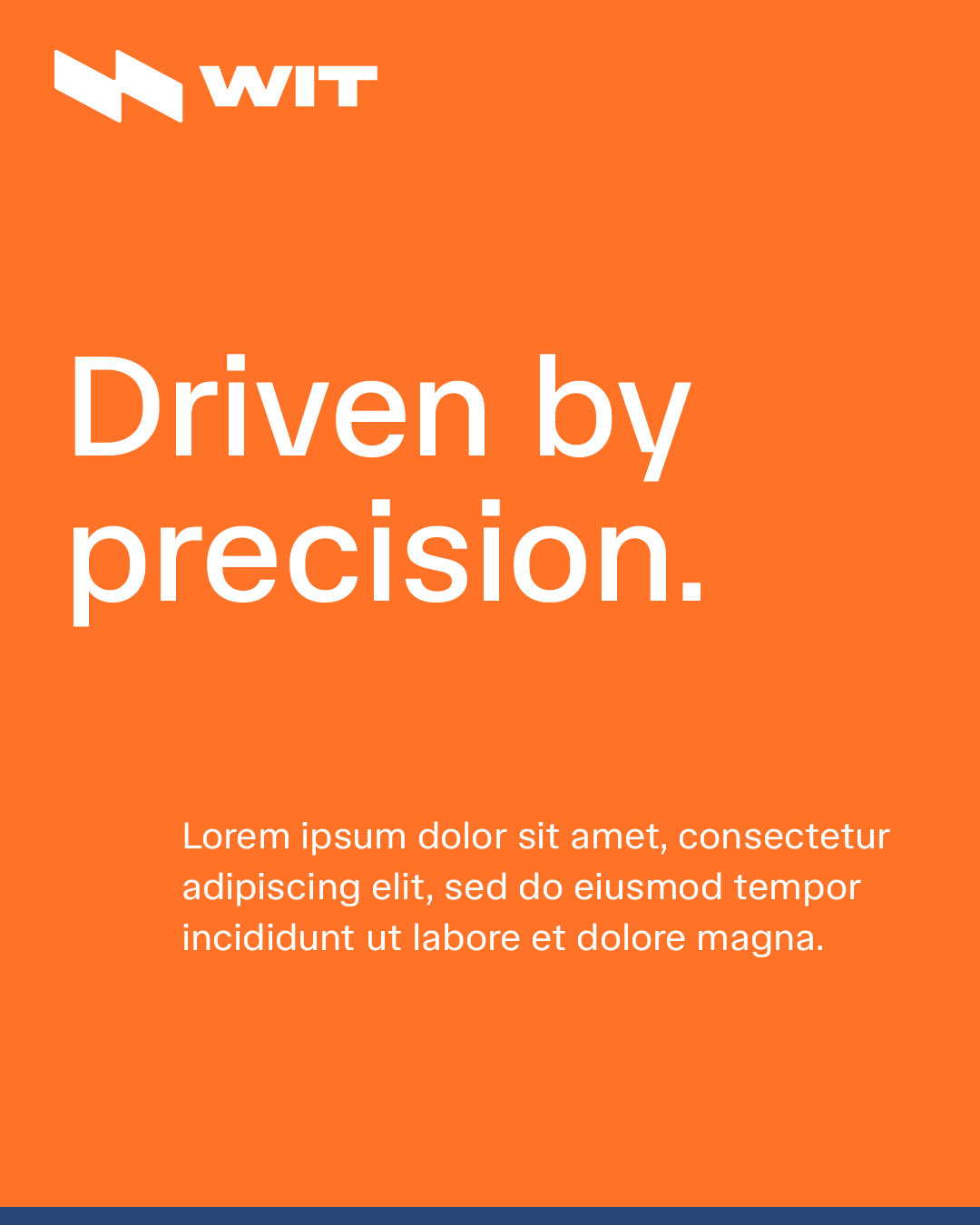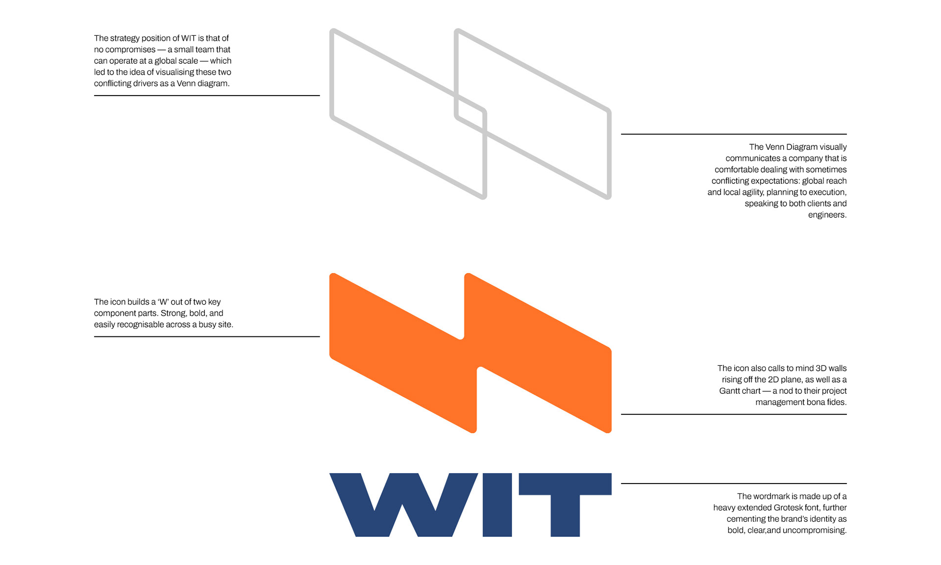 These strategic directions led us in an almost straight line to our final result. The icon represents the 'W' of WIT, and evokes the 'no-compromise' duality of competing ideals. It also provides additional references of 3D design and Gantt charts, further underlining WIT's core competencies. The colour scheme retains a more contemporary shade of blue, and combines it with a bold young orange to warn competitors thar WIT is on the field.
